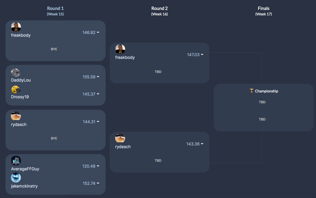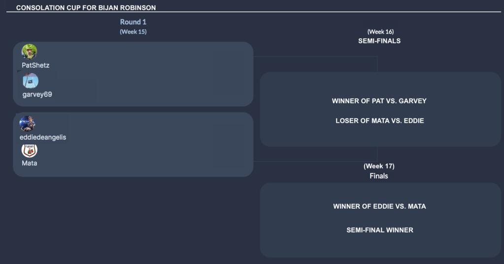 Another great, down to the wire matchup. Heading into MNF, TVB had quite a hill to climb down 26.31 & projected to lose by about 9. To TVB’s benefit though, they were rolling out Cooper & Boyd while The Spicy Boys were rolling out Andy Dalton cosplaying as a TE, Hayden Hurst. Like the previous game, at 10:30 pm TVB was down by 1.71 and projected to lose by 1.3. However, a 13 yard TD pass late in the 4th to Tyler Boyd helped secure the improbable comeback. A really good game between two teams who are playoff contenders and they both earned median wins. This was a massive win for TVB as they had been on a bit of a slide after losing 4 straight matchups. Things are looking brighter for them going forward as ArSB is now the clear cut #1 option in Detroit and Tyler Boyd’s floor should continue to be playable with Chase out for a bit. The Spicy Boys can’t be too disappointed with the result as they picked the perfect waiver wire QB in Marcus Mariota to help ease their troubles without Mahomes. I have a feeling these two will be playing meaningful (fantasy) football in December.