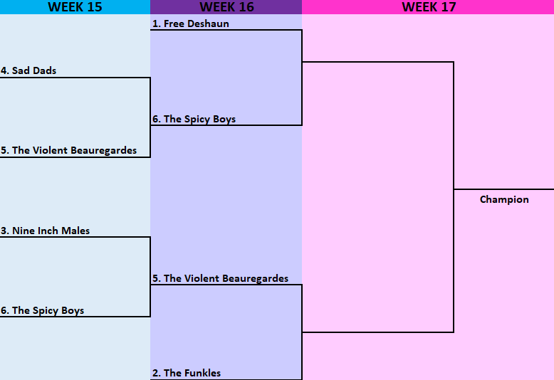 One of the most unexpected tilts takes place this week as David (The Spicy Boys) meets Goliath (Free Deshaun). Goliath comes in after a nice week of rest while David comes in on a serious high after their stunning upset of NIM. Not many people thought this would be a matchup this late in the season, but The Spicy Boys have been notorious for doing the impossible. To even get in the playoffs was a monstrous feat but now they face a test that very few teams have been able to overcome. Josh Allen against an abysmal Bears defense coupled with various other soft matchups makes it almost impossible to pick against Free Deshaun. Sleeper is stupid and doesn’t update their matchups until Wednesday so I have no idea what the Spicy Boys projections look like but what does it even matter…