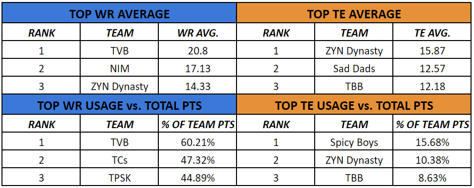 - Spicy Boys have been running the two TE lineup all season, bloating their TE usage stats.
