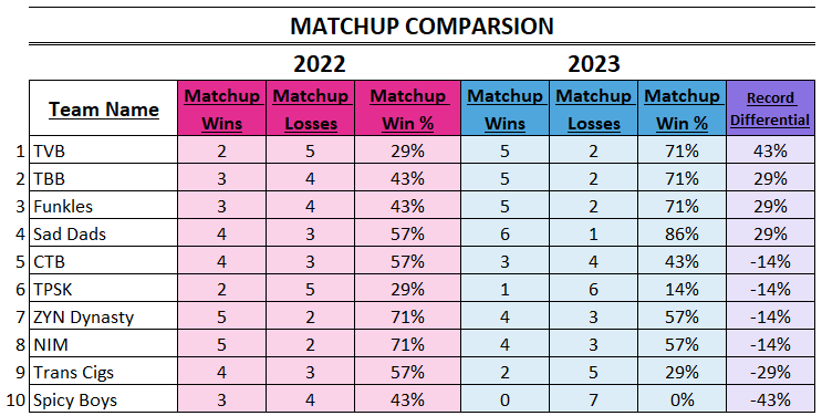 - Four Teams (TVB, TBB, Funkles & Sad Dads) have posted positive improvements on their matchup records.