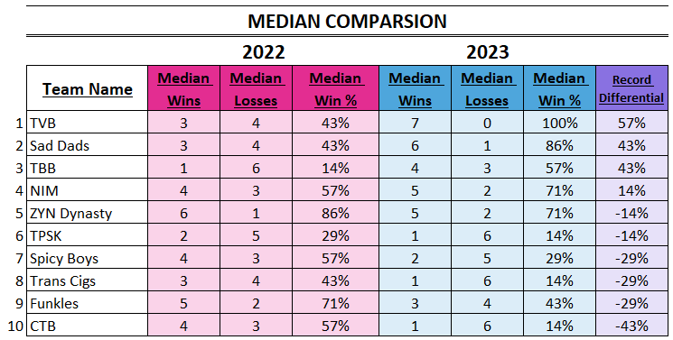- Two Teams (Funkles & NIM) have the exact same record as they did this time last year.