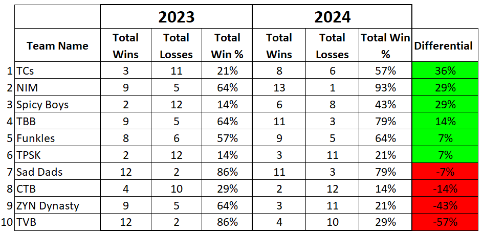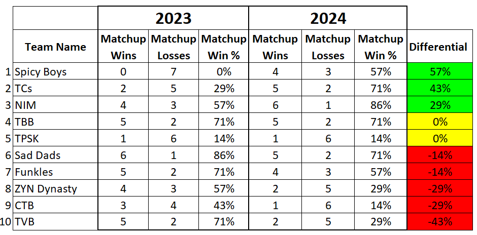 Comparison #1: 2023 Matchup Standings vs. 2024 Matchup Standings