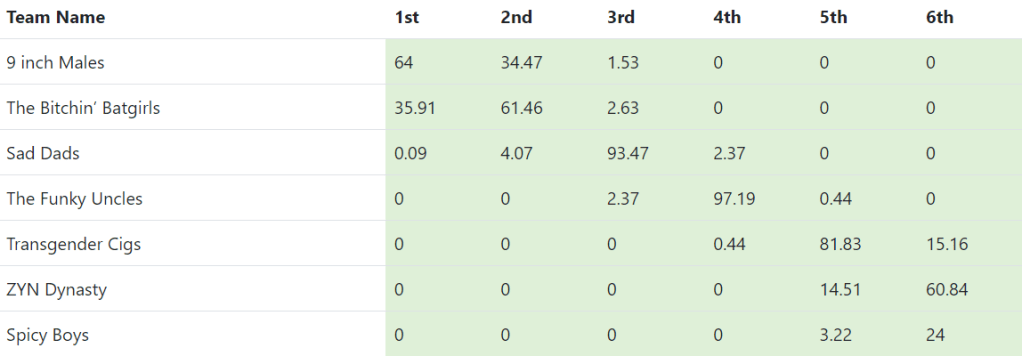 An absolutely glorious finale. Two of the top teams in the league for a chance to get the 2nd piece of silverware of the year. NIM come into the matchup already owning the first piece of silverware in the form of the community shield. On paper, NIM are projected to handle business and take home the trophy. However, after some deeper diving, Sad Dads are beneficiaries of some pretty weak matchups. I like them in the upset.